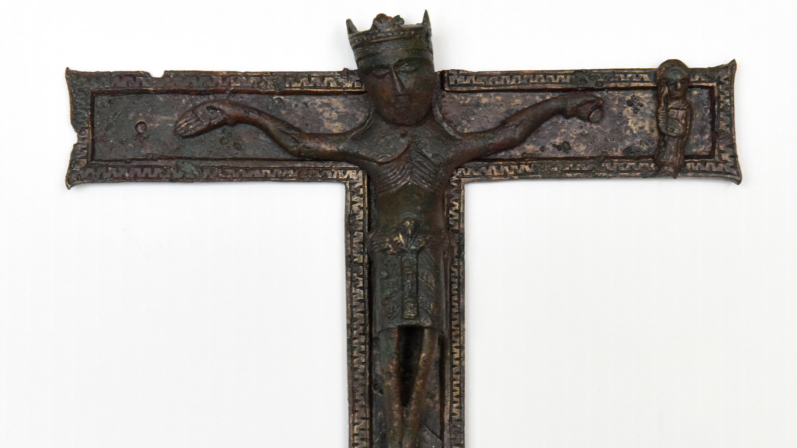 – Crucifix, première moitié ou milieu du XIIe siècle, bronze. Grand Est ou Bourgogne-Franche-Comté, © MUDAAC Epinal, cliché CD88-JL